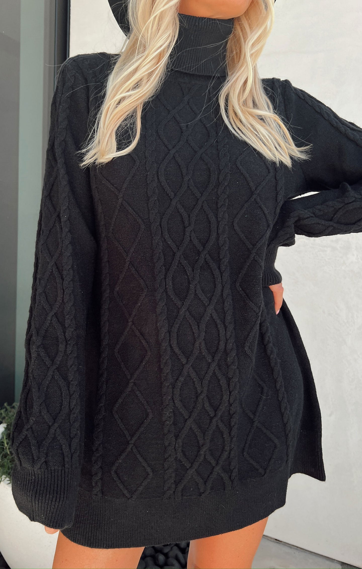 With drop shoulders, cable knit detailing and a ribbed turtleneck you will love this timeless knit mini dress. Cinch the waist with your favorite belt or leave as is for a cozy comfy look.