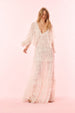 Introducing the Roylan Dress. This full-length, Bohemian-inspired gown stuns with delicate, embroidered flowers dancing amongst a lightweight mesh fabric featuring a gorgeous arrangement of laces throughout. The dress features a plunging V-neckline, two-tiered bell sleeves, and a cape-inspired bodice that ties at the back. The piece includes a separate chiffon slip lining that’s length is shorter than the dress to be worn underneath if desired.